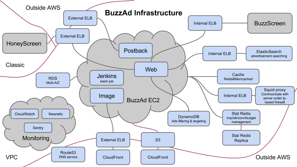 버즈빌에서는 잠금화면 리워드앱인 허니스크린 한국,일본,대만 버전과 애드네트워크인 버즈애드 그리고 잠금화면 SDK인 버즈스크린을 운영하고 있습니다. 그런데 이 모든 서비스를 현재 단 6명의 개발자가 운영하고 있어서 서버 운영 리소스를 줄이기 위해 가능한 많은 부분을 AWS에 의존하고 있습니다. AWS가 없었다면 지금의 인원으로 이 모든 서비스를 운영하는 것은 불가능했을 것입니다. 버즈빌 초기에는 EC2, ELB, RDS, S3을 활용했고 그 후 Auto Scaling, CloudFront, Lambda, DynamoDB, Route 53, Kinesis, SNS, VPC 등을 사용하기 시작했습니다. 이번 포스팅에서는 그동안 사용했던 서비스들에 대해 소개하며 유용한 팁, 그리고 제가 느낀 점들을 공유하겠습니다.