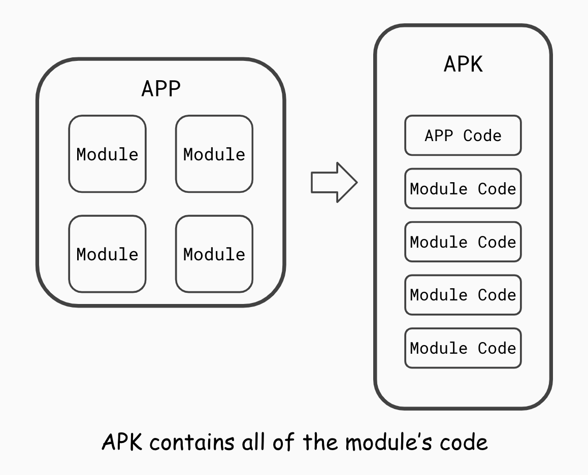 위와 같이 앱의 경우 빌드되는 결과물인 APK 파일 안에 앱에 필요한 모든 코드가 다 들어있다. 즉, 별도로 각 모듈을 배포할 필요가 없고 APK 파일 안에 모든 모듈 데이터가 포함된다.