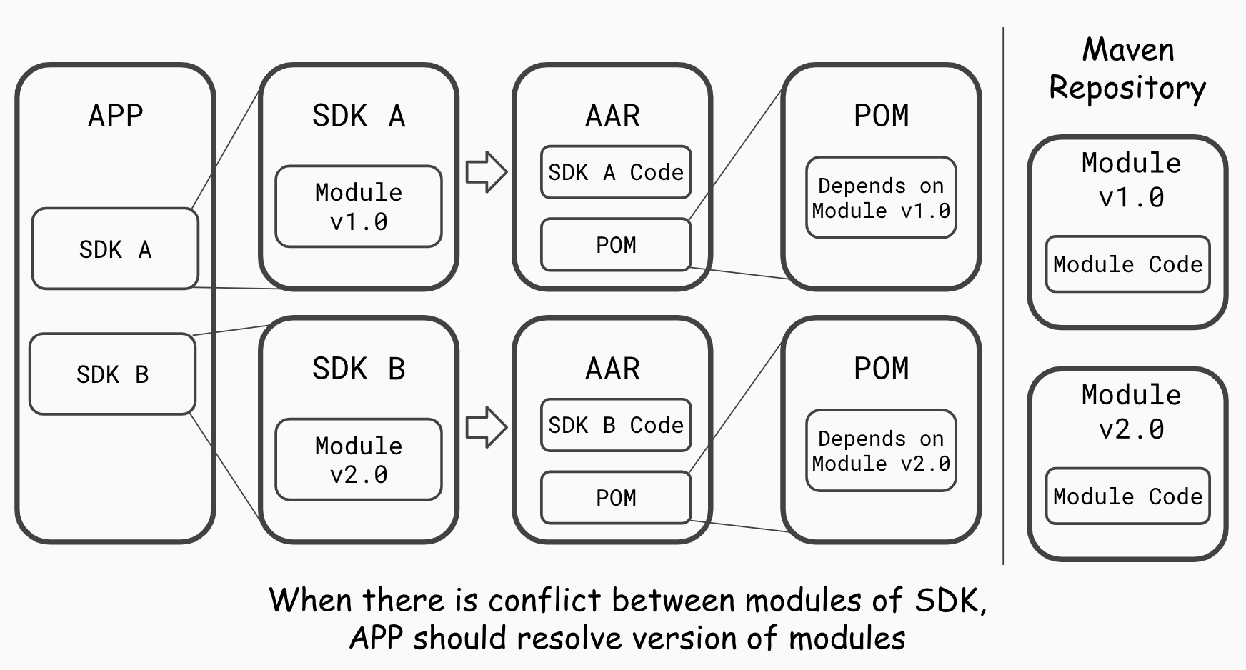 만약 여러 SDK가 동일한 모듈을 참조하고 있고 해당 SDK들이 하나의 앱에서 빌드되고 있다면, 모듈간 충돌에 대해 고민해봐야 한다.